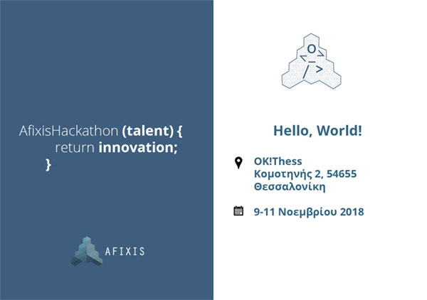 Ο εκπαιδευτικός οργανισμός Afixis (afixis.org) διοργανώνει το πρώτο του hackathon στις 9-11 Νοεμβρίου 2018 στον χώρο του accelarator OK!Thess (Κομοτηνής 2, Θεσσαλονίκη) δίνοντας την δυνατότητα σε ομάδες προγραμματιστών και designers να κάνουν hack σε νέα projects και να προβάλλουν τα ταλέντα τους. Σε συνδυασμό με την άμεση επαφή με άτομα της αγοράς εργασίας από μέντορες κατά τη διάρκεια του hackathon έως και κριτές στο τέλος, cool βραβεία και χρήσιμο networking με επαγγελματίες και συμφοιτητές, το Afixis Hackathon είναι ένα event που δεν πρέπει να χάσεις!