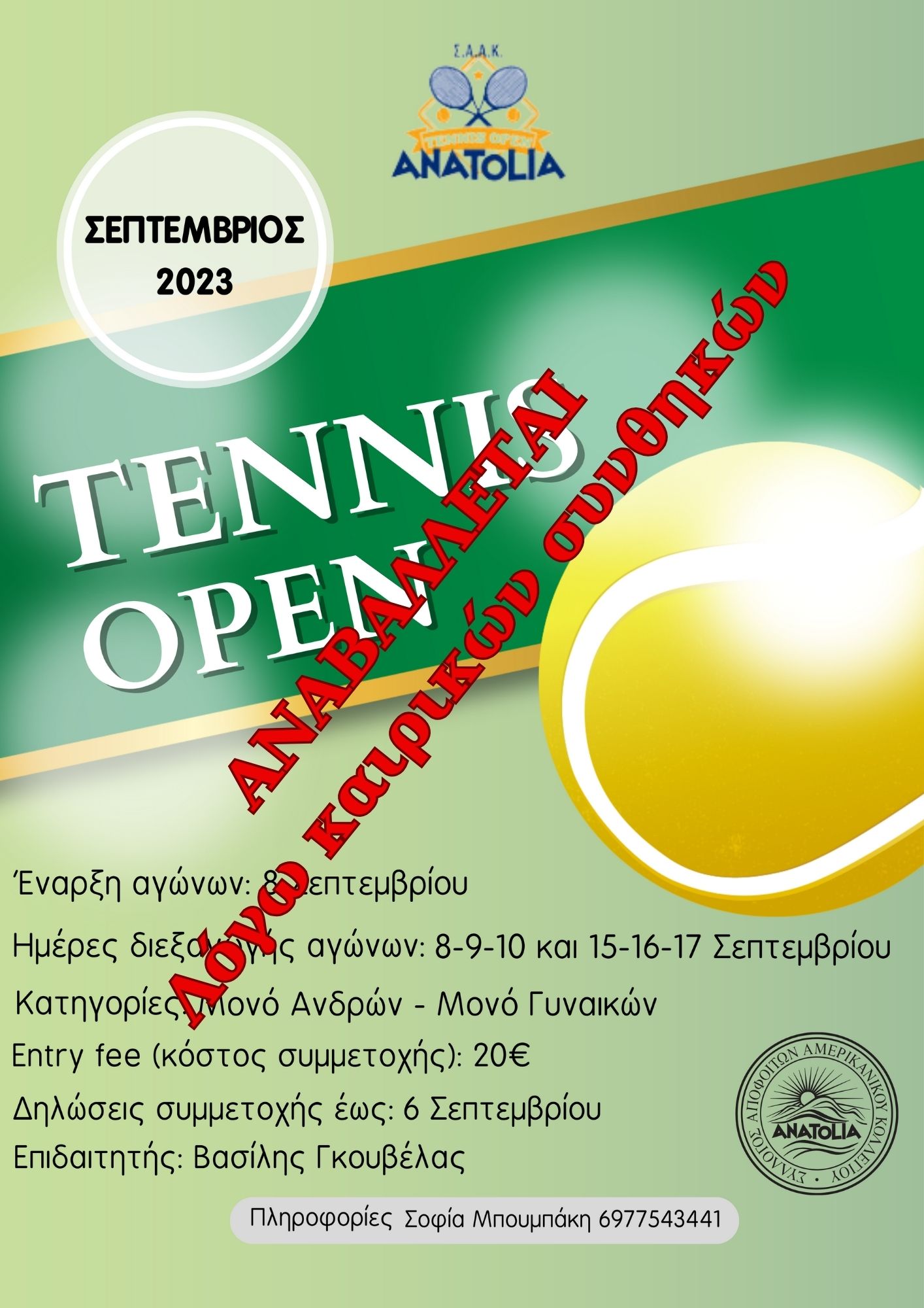 Το τουρνουά tennis – open 2023- που επρόκειτο να διεξαχθεί στα γήπεδα του Αμερικανικού Κολλεγίου ANATOLIA από τις 08-09-2023 αναβάλλεται λόγω των καιρικών συνθηκών.