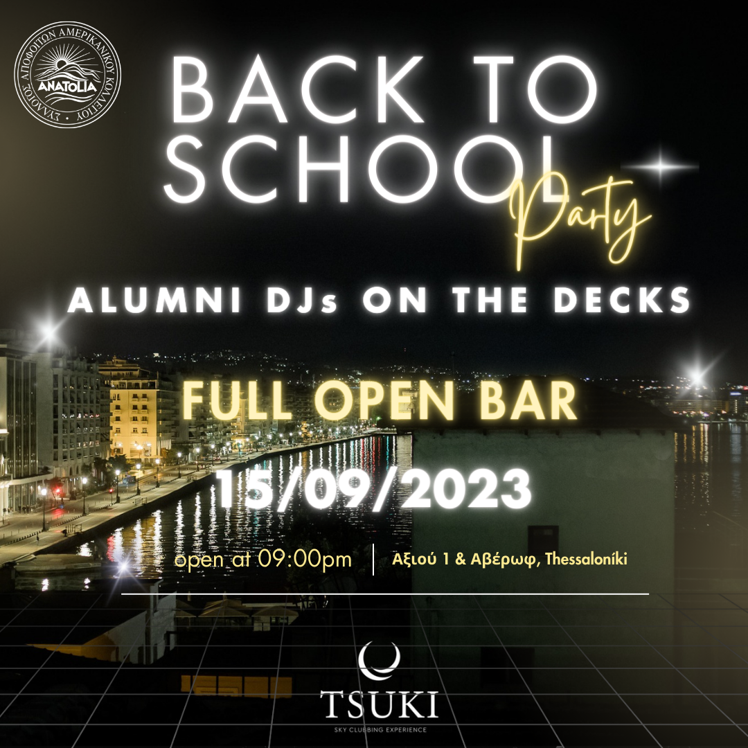 Σας περιμένουμε στο Back to School Party του Σ.Α.Α.Κ. Ανατόλια την Παρασκευή  15 Σεπτεμβρίου, 21:00, στο Tsuki Sky Club, Αξιού  1 & Αβέρωφ | Λιμάνι, Θεσσαλονίκη