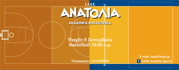 Ο Σ.Α.Α.Κ. Ανατόλια ανακοινώνει την έναρξη της Ακαδημίας Basketball το Σάββατο 8 Σεπτεμβρίου 2018, ώρα 10:00 π.μ.