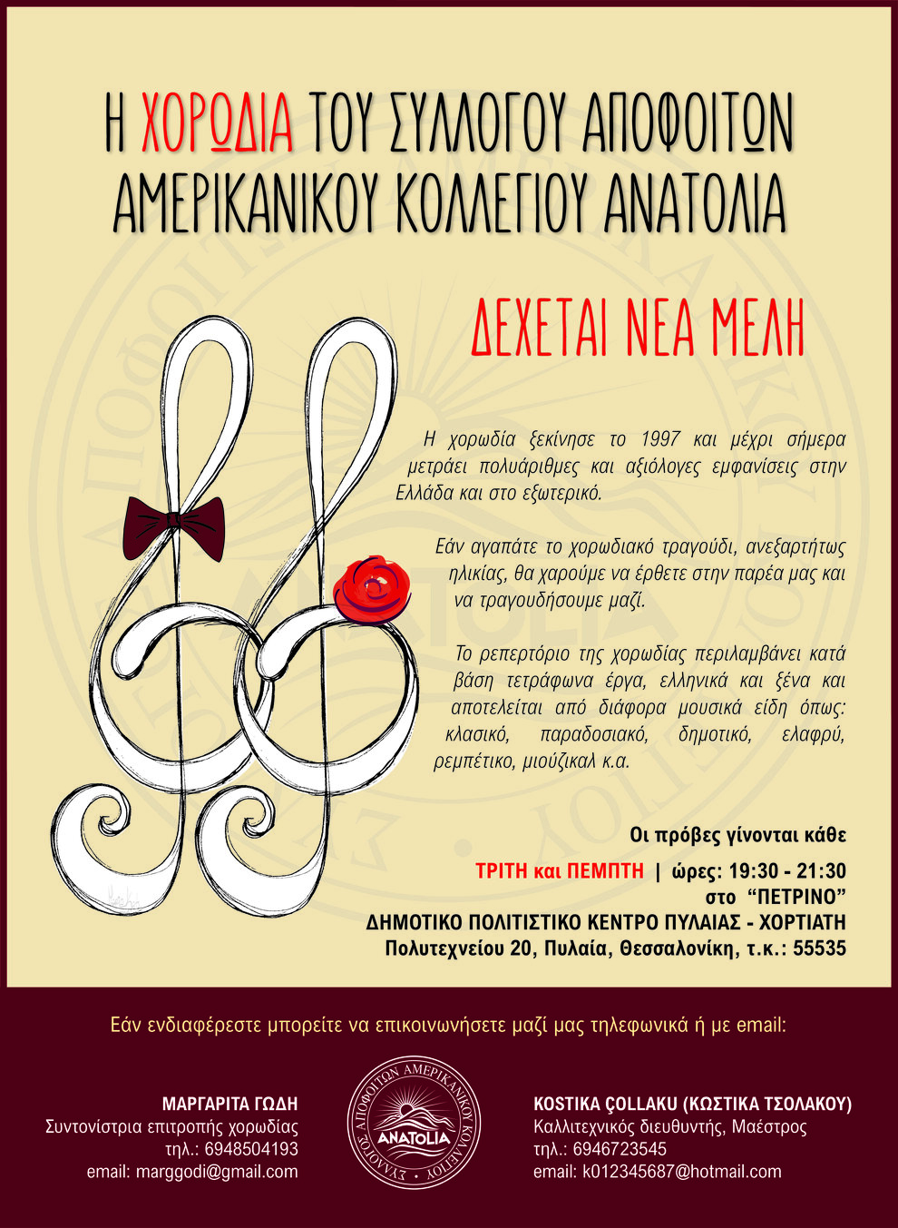Η ΧΟΡΩΔΙΑ ΤΟΥ ΣΥΛΛΟΓΟΥ ΑΠΟΦΟΙΤΩΝ ΑΜΕΡΙΚΑΝΙΚΟΥ ΚΟΛΛΕΓΙΟΥ ΑΝΑΤΟΛΙΑ ΔΕΧΕΤΑΙ ΝΕΑ ΜΕΛΗ