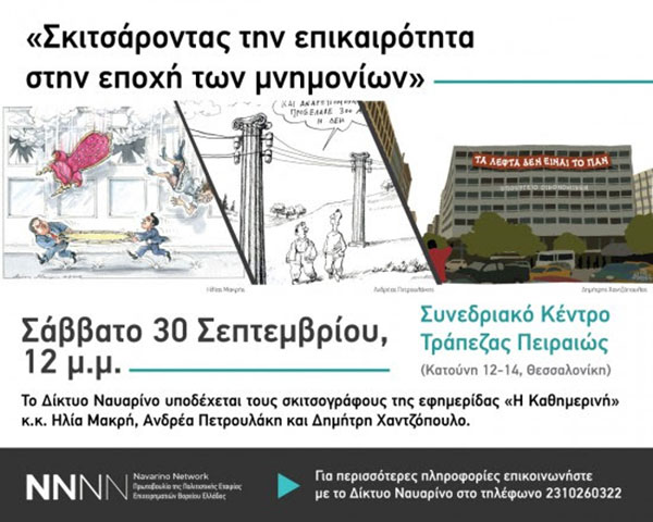 Το Δίκτυο Ναυαρίνο υποδέχεται τους σκιτσογράφους της εφημερίδας «Η Καθημερινή» κ.κ. Ηλία Μακρή, Ανδρέα Πετρουλάκη και Δημήτρη Χαντζόπουλο για μια δημόσια συζήτηση με θέμα «Σκιτσάροντας την επικαιρότητα στην εποχή των μνημονίων».