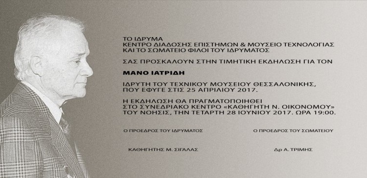 Ο Μάνος Ιατρίδης, διακεκριμένος απόφοιτος του Αμερικανικού Κολλεγίου Ανατόλια της τάξης του ’46, ιδρυτής και Επίτιμος Πρόεδρος του Τεχνικού Μουσείου Θεσσαλονίκης (ΤΜΘ), απεβίωσε στις 25 Απριλίου 2017. Αναγνωρίζοντας την πολύτιμη προσφορά του Μάνου Ιατρίδη στον χώρο των επιχειρήσεων, του πολιτισμού και της εκπαίδευσης, το Κέντρο Διάδοσης Επιστημών & Μουσείο Τεχνολογίας ΝΟΗΣΙΣ, διοργανώνει για εκείνον μία […]