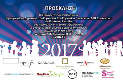 Τιμή πρόσκλησης 25€ το άτομο περιλαμβάνει μπουφέ και μια φιάλη κρασί /2 άτομα Δηλώσεις συμμετοχής Δημοτικό & Νηπιαγωγείο Αλεξοπούλου Έφη 6944 573578 Α Γυμνάσιο Αμαραντίδου Δέσποινα 6977 970404 Β Γυμνάσιο Τσαβδάρογλου Δήμητρα 6979 809024 Α Λύκειο & ΙΒ Τσακπίνη-Παντελίδου Χρύσα 6976 432324 Β Λύκειο Μέρτζου Εύα 6977 700450 & Θωμοπούλου Βίκυ 6944 362946