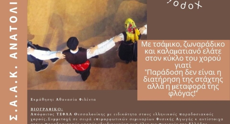 Με τσάμικο, ζωναράδικο κ καλαματιανό ελάτε στον κύκλο του χορού γιατί “Παράδοση δεν είναι η διατήρηση της στάχτης αλλά η μεταφορά της φλόγας!” Τα μαθήματα θα διεξάγονται, κάθε Τρίτη 19:00-20:30 Γυμναστήριο Γυμνασίου – Annex, Κολλέγιο ΑνατόλιαΕκμάθηση: Αθανασία ΦιλένταΒΙΟΓΡΑΦΙΚΟ:Απόφοιτος ΤΕΦΑΑ Θεσσαλονίκης με ειδικότητα στους ελληνικούς παραδοσιακούς χορούς.Συμμετοχή σε σειρά επιμορφωτικών σεμιναρίων Φυσικής Αγωγής κ αντίστοιχα στους […]