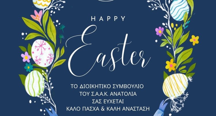 Το Διοικητικό Συμβούλιο του Σ.Α.Α.Κ. Ανατόλια σας εύχεται Καλό Πάσχα & Καλή Ανάσταση!Σας ενημερώνουμε ότι το γραφείο του Συλλόγου θα παραμείνει κλειστό από 21/04/2022 έως 26/04/2022.
