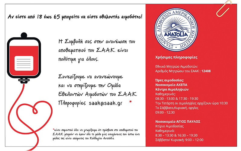 Στο πλαίσιο της Παγκόσμιας Ημέρας Εθελοντή Αιμοδότη ο Σ.Α.Α.Κ. Ανατόλια σας καλεί