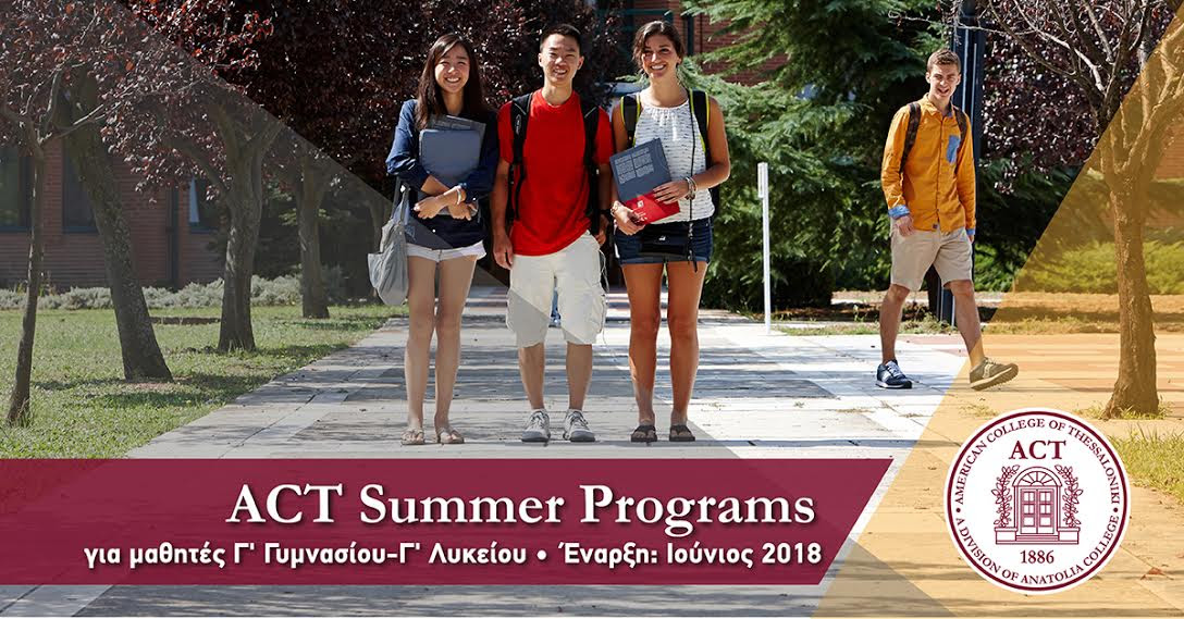 Ενημερωθείτε για τα Summer Programs του ACT, για μαθητές και μαθήτριες από Γ’ Γυμνασίου έως Γ’ Λυκείου, που προσφέρουν την ευκαιρία να περάσουν το καλοκαίρι τους παρακολουθώντας μαθήματα όπως οικονομικά, βιοτεχνολογία, και άλλα καινοτόμα προγράμματα κολλεγιακού επιπέδου σε ένα πραγματικά διεθνές, πολυπολυτισμικό περιβάλλον.