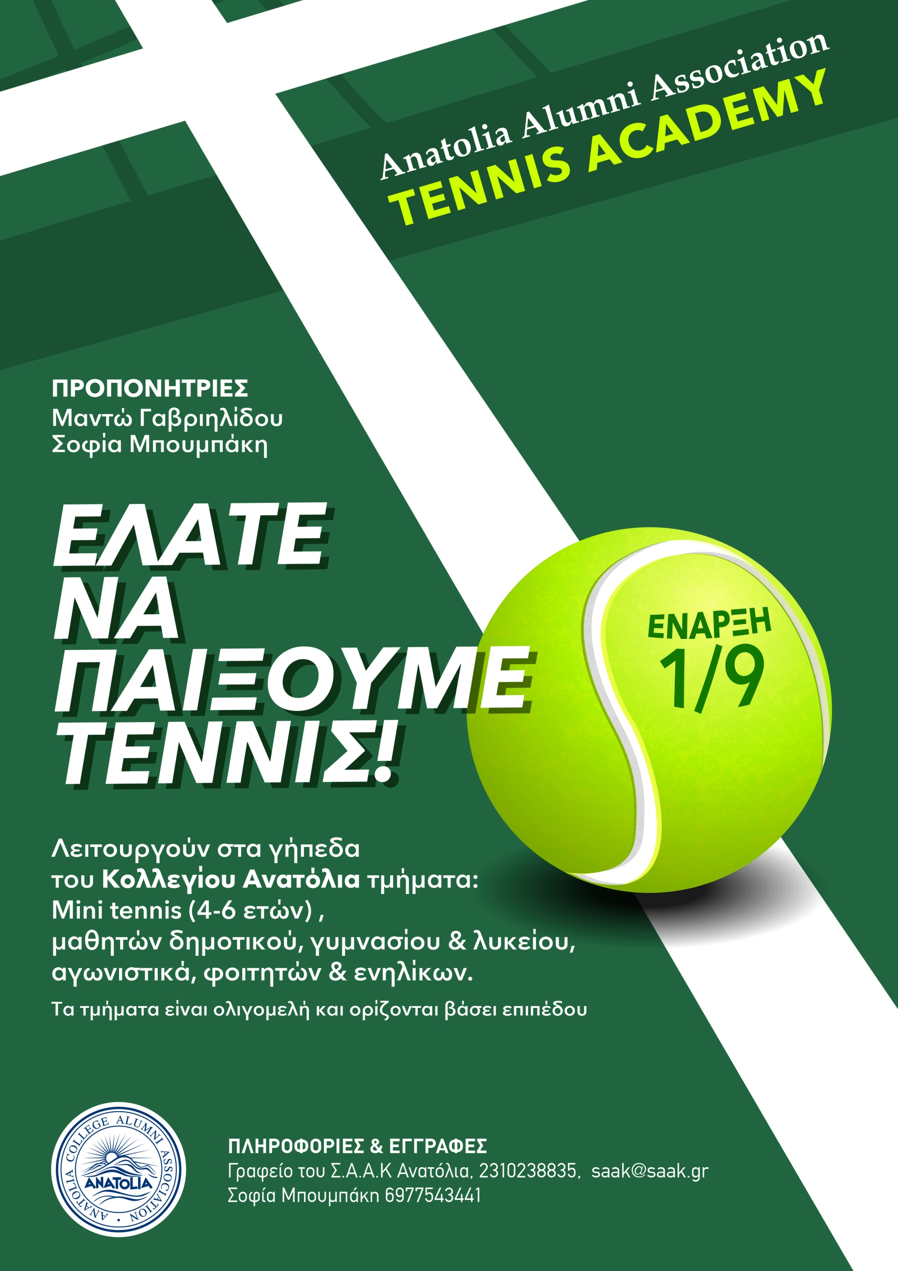 Την Τετάρτη 7/9 στα γήπεδα τέννις του Κολλεγίου Ανατόλια ο ΣΑΑΚ με τους προπονητές του υποδέχονται με χαρά όλους όσους θέλουν να δοκιμάσουν να παίξουν και να ενημερωθούν για τα απογευματινά προγράμματα μαθημάτων τέννις για τη χρονιά που ξεκινά!