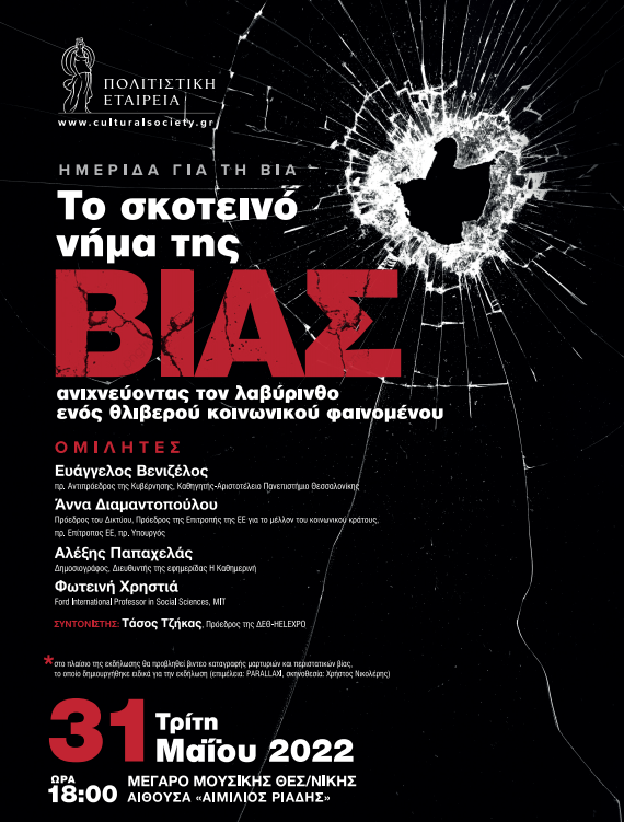 Η Πολιτιστική Εταιρεία Επιχειρηματιών Βορείου Ελλάδος, σε μια προσπάθεια να προσεγγίσει θεμελιώδη αλλά και οδυνηρά προβλήματα της καθημερινότητας, παίρνει την πρωτοβουλία να οργανώσει μια ουσιαστική συζήτηση γύρω από το θέμα της βίας.